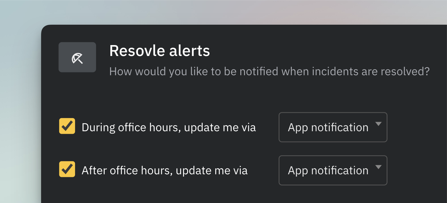 You can customize how you receive resolved incident alerts, including different mediums during office hours.