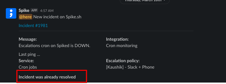 The Slack app will notify you that the incident has already been resolved, preventing duplicate actions.
