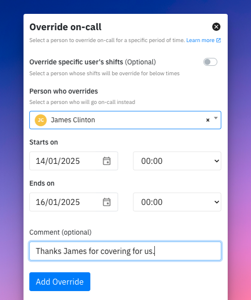 On-call overrides give your team flexibility by allowing temporary adjustments to your schedule without permanently changing it. Whether you're stepping out for a dentist appointment or taking a well-deserved break after a hectic week, overrides help ensure that incident coverage continues seamlessly. Overrides are non-recurring and ideal for short-term coverage.