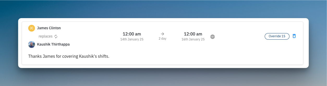 Example: In the screenshot below, James has been assigned an override to cover Kaushik's shifts from January 14th to January 16th at midnight. The comment provides clarity about the reason for the override.