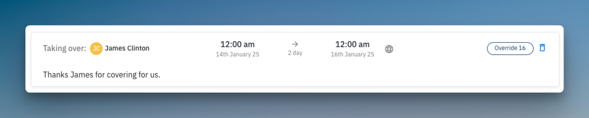 Example: In the screenshot below, James has been assigned an override to cover **everyone's** shifts from January 14th to January 16th at midnight. The comment provides clarity about the reason for the override.